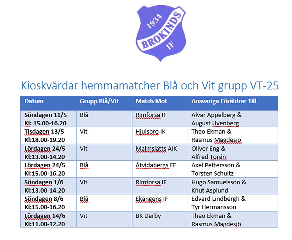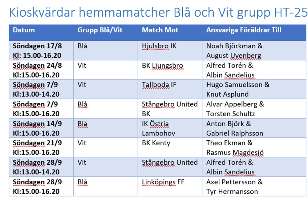 OBS: Om ni inte kan den match som ni har blivit tilldelad vänligen byt matchdag sinsemellan och meddela ledare Jenny, wannstrom.jenny@gmail.com om förändringen som är gjord så vi kan hålla kioskschemat uppdaterat.