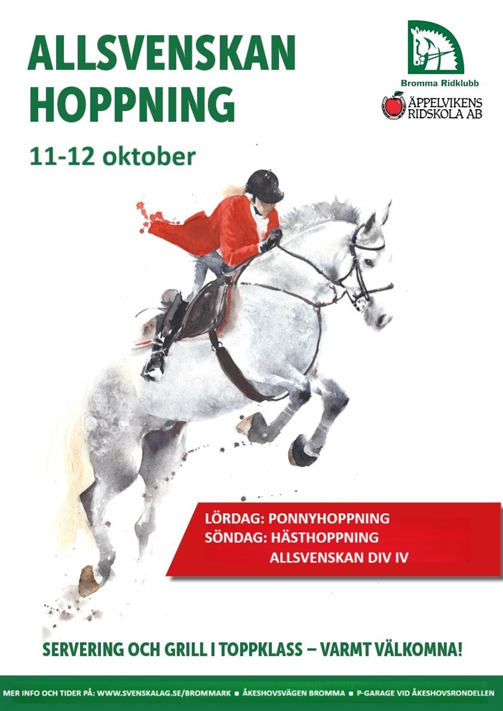 Nu i helgen den 11-12 oktober, ordnar vi hopptävlingar för ponny på lördag och häst på söndag. Tävlingarna börjar kl 9 båda dagarna. På söndagen är det också final av Allsvenskan division IV. Kom gärna förbi och heja på alla fina ekipage. Grillen och cafét är öppna båda tävlingsdagarna.
