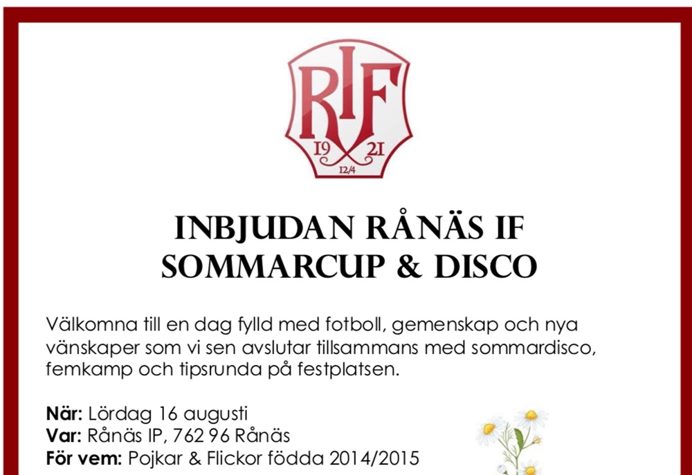 P15 Cup + disco i Rånäs på lördag 16/8 - Information