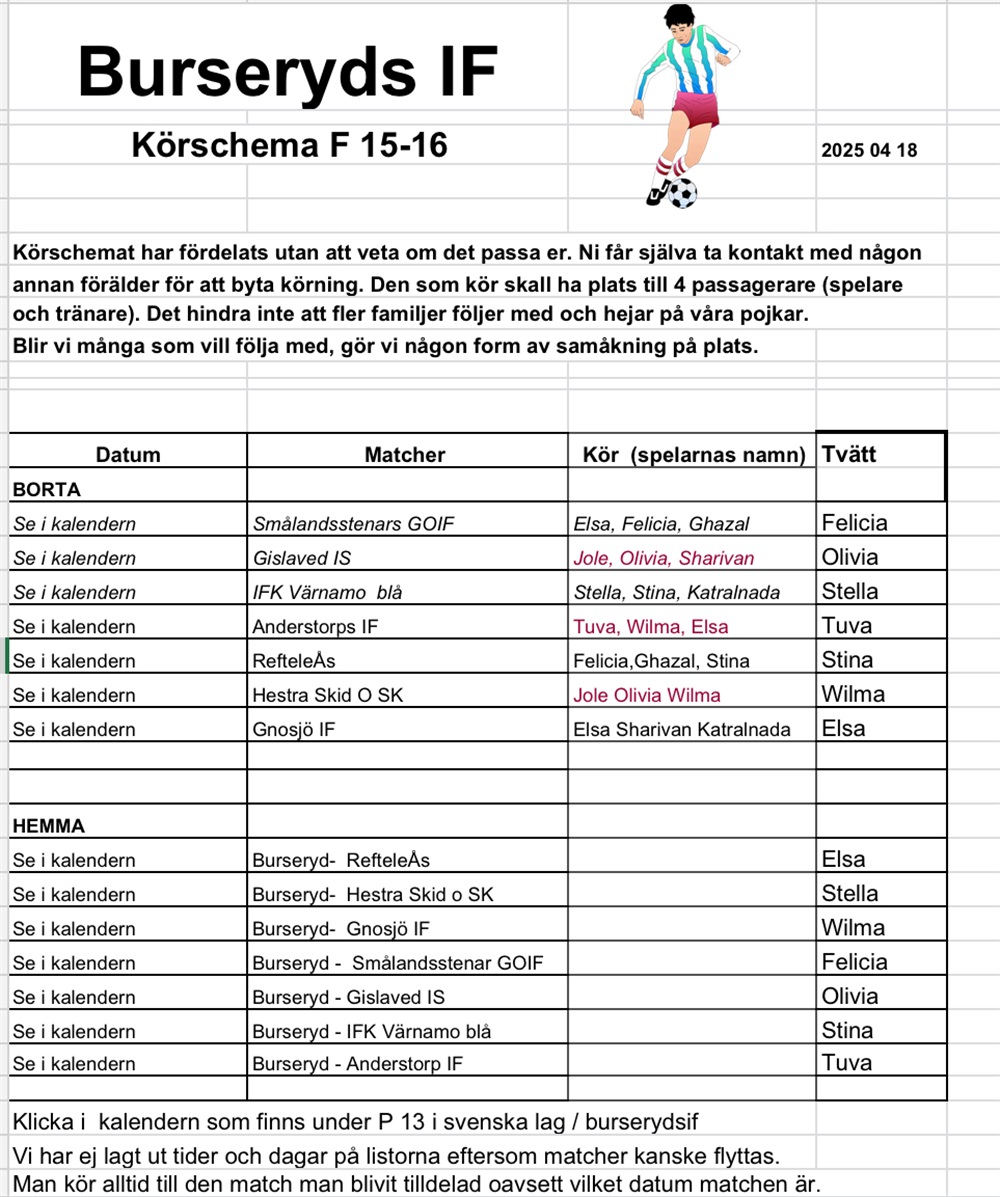 Eftersom vi inte valt några Lagföräldrar ännu så har jag gjort ett körschema.