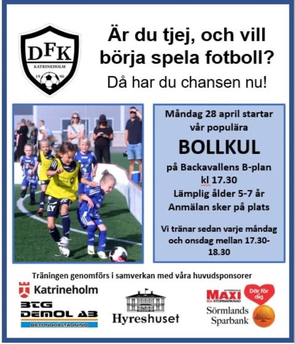 Nu startar snart vår populära Bollkul för tjejer i åldern 5-7 år. För äldre tjejer finns flera olika träningsgrupper. Klicka på länken här nedanför så ser du våra olika grupper och när de tränar. Du behöver inte föranmäla dig. Anmälan tar vi upp vid träningen. Välkomna! https://www.svenskalag.se/dfkkatrineholm/sida/83567/vara-traningstider