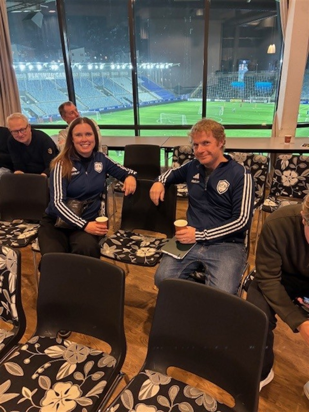 Två av DFK:s deltagare, Sanna Öhlin och Johan Wehlin, vid IFK Norrköpings fotbollssymposium som hölls på Idrottsparken på onsdagskvällen.