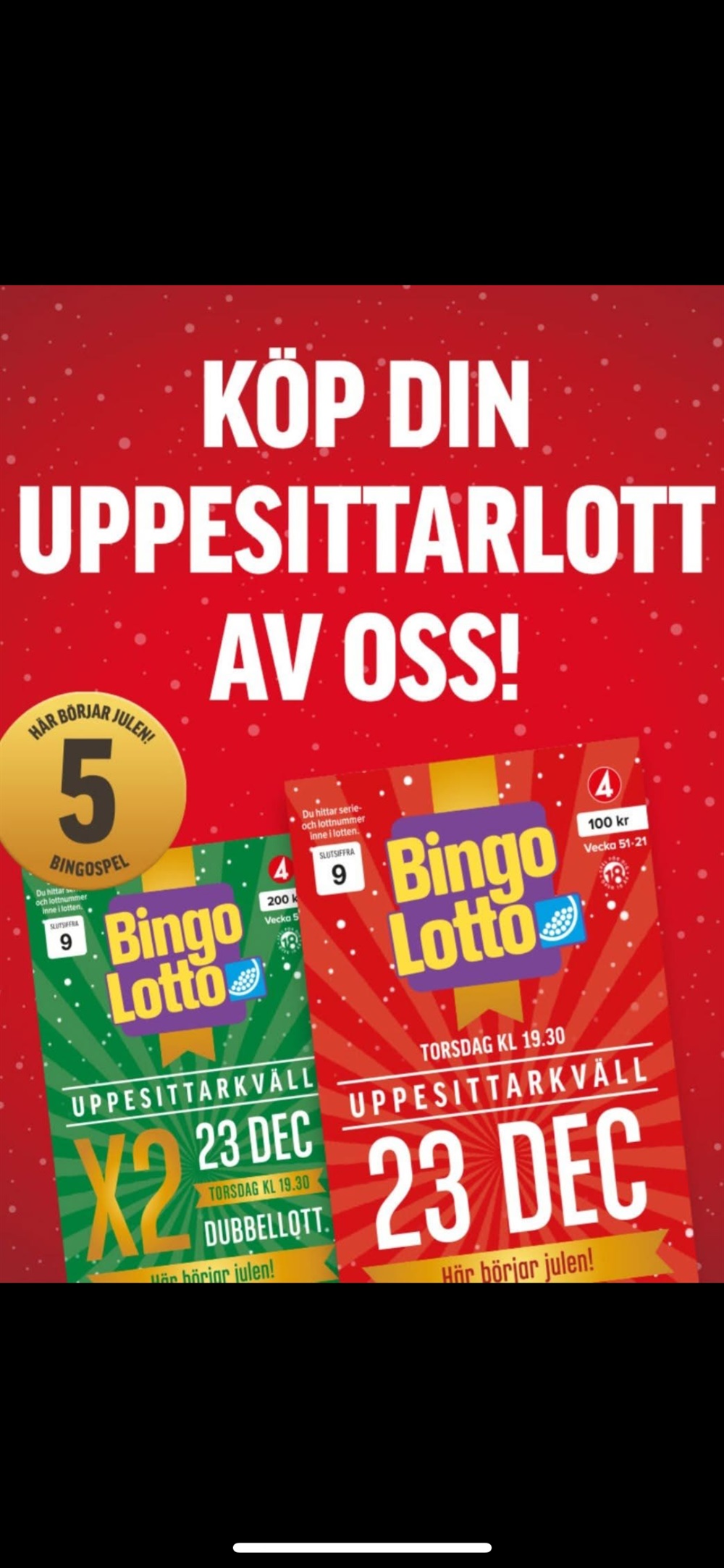 Det finns bingolotter till uppesittarkvällen x1, x2, x3 och nyårslotter x1, x2.