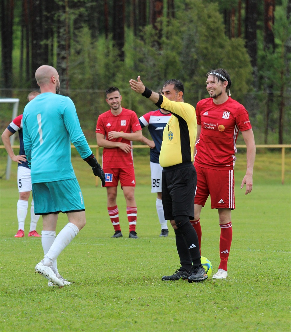 Ytterligare en frispark lägger Romans Klimausks från halva plan, bollen lyfts in i straffområdet och enligt domaren och Najib Ahmadi så styr Najib in bollen i en för motståndarna rörig situation i straffområdet och det står 5-0 till Ämtervik på tavlan. Vi får tro att domaren har koll och det var säkert så att Najib hade delar av luggen på bollen.