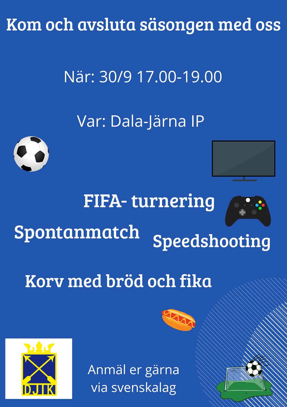 Kom och avrunda säsongen tillsammans med oss. Den 30 September klockan 17-19 är ni välkomna till IP. Det finns möjlighet att testa på speedshooting, spontanmatch, spela FIFA-turnering eller bara hänga. Vi bjuder på korv med bröd och fika. Anmäl er gärna via kalendern i svenskalag.