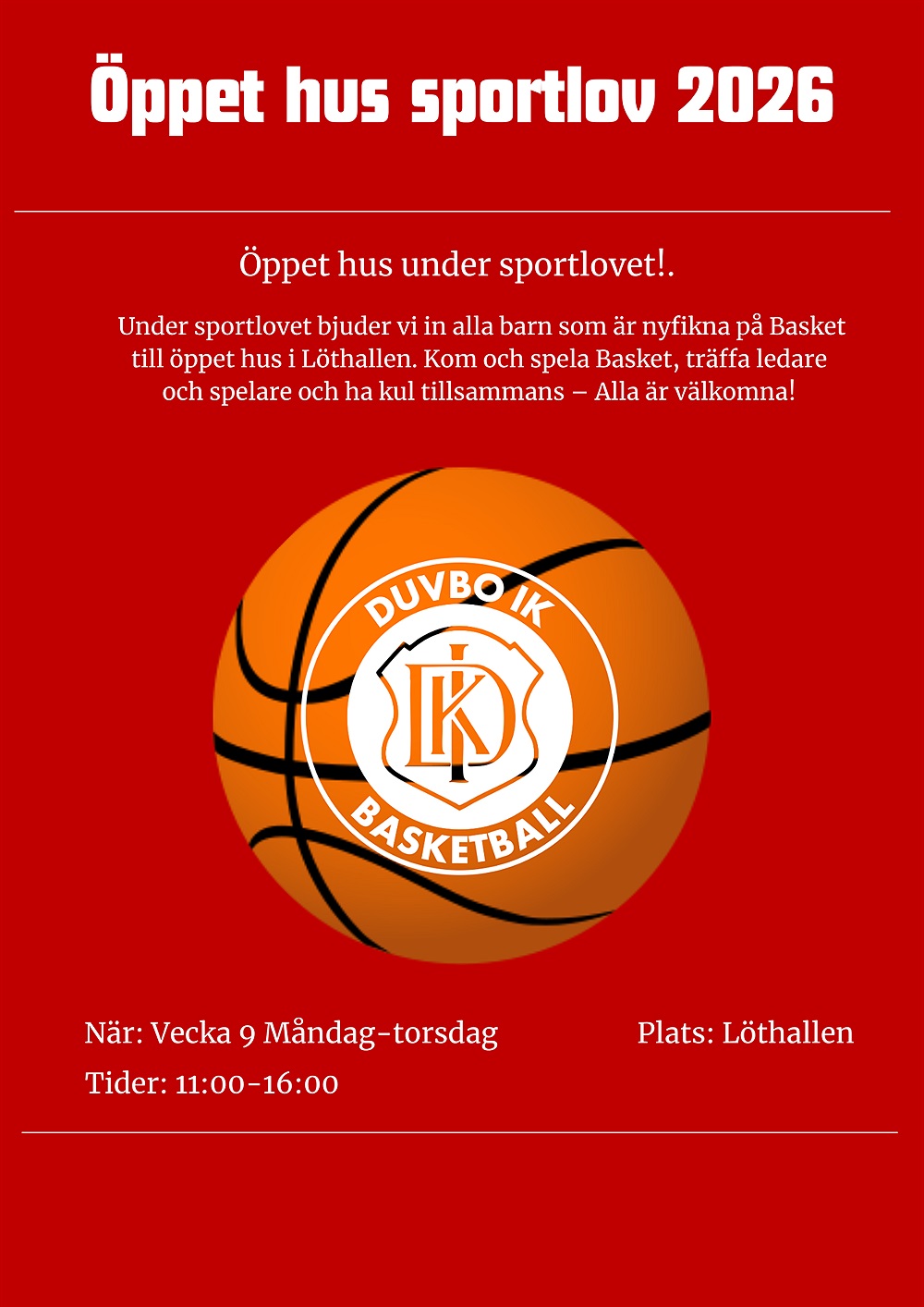 Under vecka 9 bjuder Duvbo IK in alla barn till öppet hus med basket. Kom och spela, träffa ledare och ha roligt tillsammans!