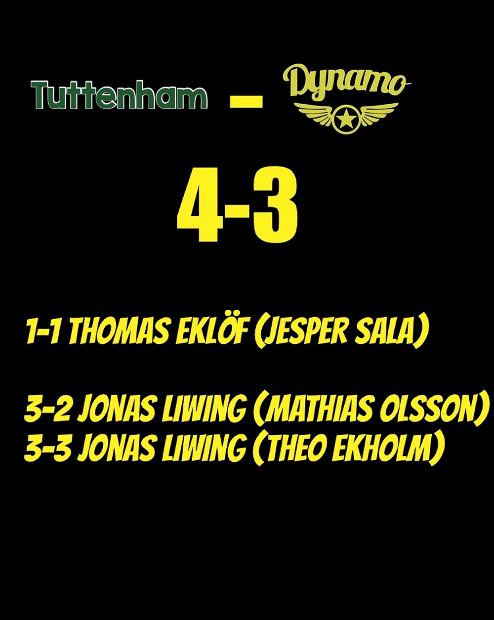 Theo Ekholm med en pass in framför mål och finner Jonas Liwing som knackar dit en relativt hög boll....3-3 och glädjevrål Dynamo!! med enbart ca 30 sek kvar av matchen!!