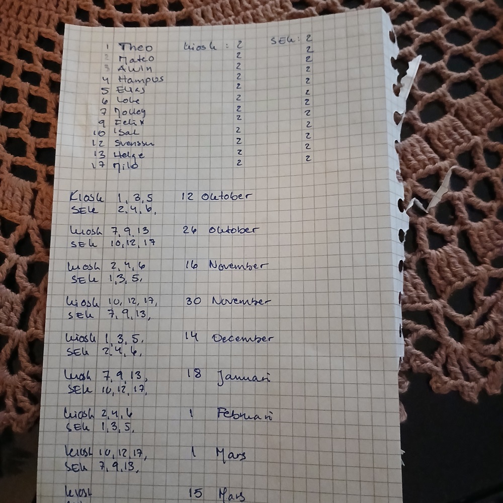 Vi är 12 st kvar i laget. Det blir 2 gånger vardera i kiosk och sek. Sista hemmamatchen 15 mars 2026 löser vi då.