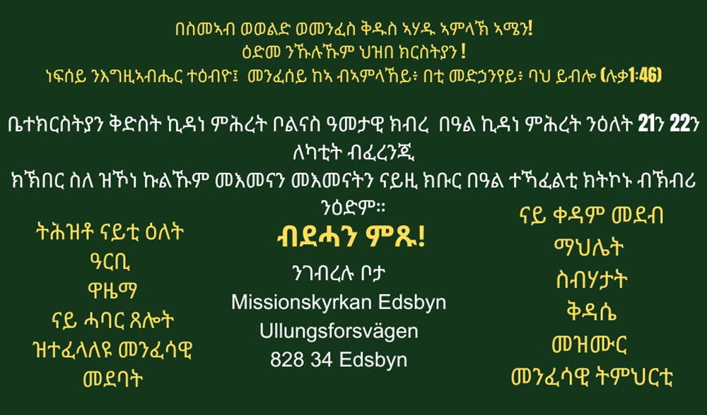 ሰላም ኣምላኽ ምስ ኩልኹም ይኹን ዝኸበርኩም ምእመናትን ምእመናንን። እምበኣር እቲ ዓመት መጸ ብሃንቀውታ እንጽበዮ ዓመታዊ በዓልና፡ በዓል ቅድስት ኪዳነ ምህረት ንዕለት 21-22 ለካቲት ክውዕል እዩ። ስለዚ ኩልኹም ምእመናንን ምእመናትን በዚ ዕለት እዚ ምሳና ተረኺብኩም ተኻፈልቲ በረኸት ክትኮኑ ቤተ ክርስትያን ቅድስት ኪዳነ ምህረት ቦልናስ ብኽብሪ ትዕድም።