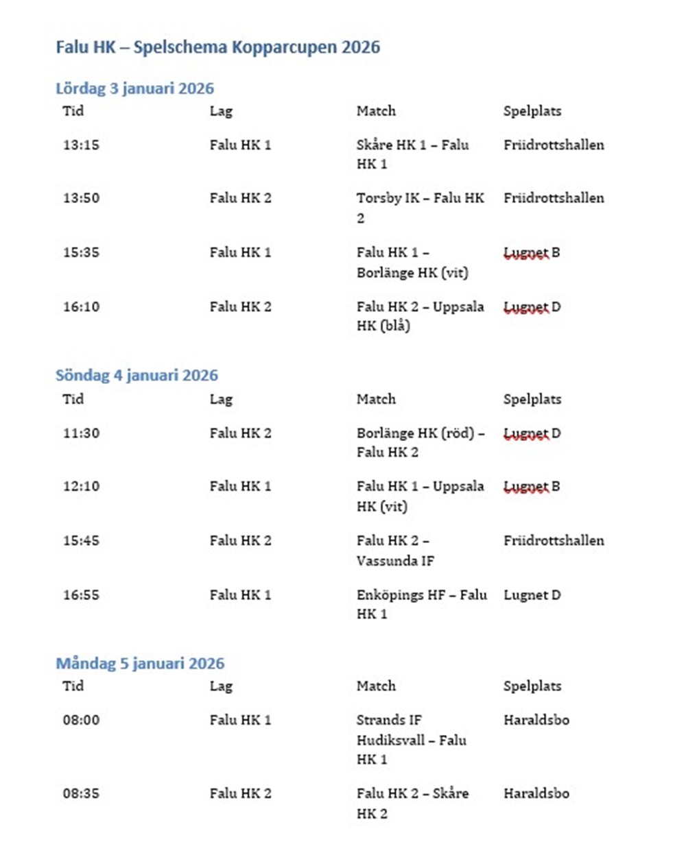 Här är spelschemat för KC 2026. Upplägget kommer att vara så att hela F11 spelar matcherna som Falu HK 2 och sedan spelas matcherna för Falu HK 1 tillsammans med spelare från F10. Då kommer 6-7 skiftande spelare från F10 vara med och 5-6 skiftande spelare från F11 (beroende av intresse och ork). Det kommer ut en kallelse inom kort där man får svar på om man vill vara med och spela i mixlaget. Antalet matcher det blir för varje enskild spelare beror på hur många som vill spela. Som ni ser i spelschemat så är många av matcherna tätt inpå varandra.