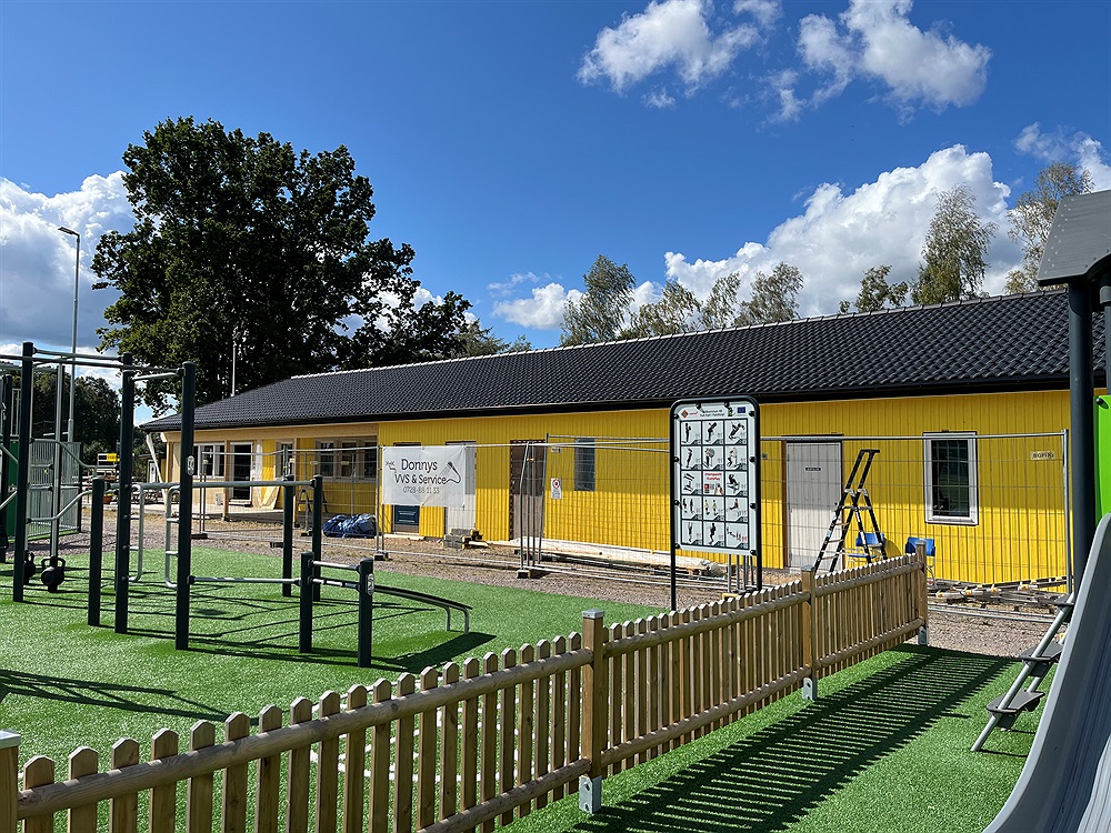 Bygget av de nya omklädningsrummen pågår för fullt. Under sommaren har plattan gjutits och en ny byggnad har byggts samman med omklädningsrummen.