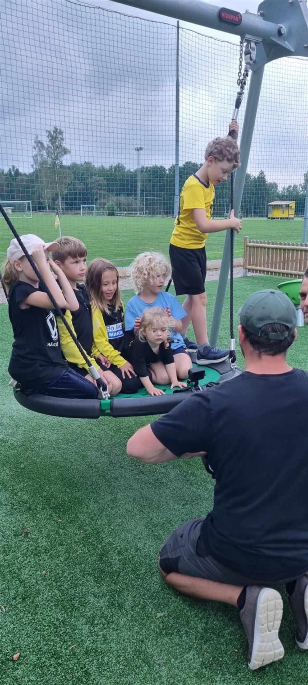 Givetvis var det inte en tom idrottsplats som mötte fotograferna och filmfolket. På plats befann sig cirka 20 spelare från F13-laget som vi har ihop med Röke IF och Hörja IF, samt ett mindre antal killar som spelar fotboll i föreningen, för en match på multiarenan. Lekplatsen var i sin tur fylld av ett tiotal yngre barn medan cirka tio vuxna nyttjade utegymmet.