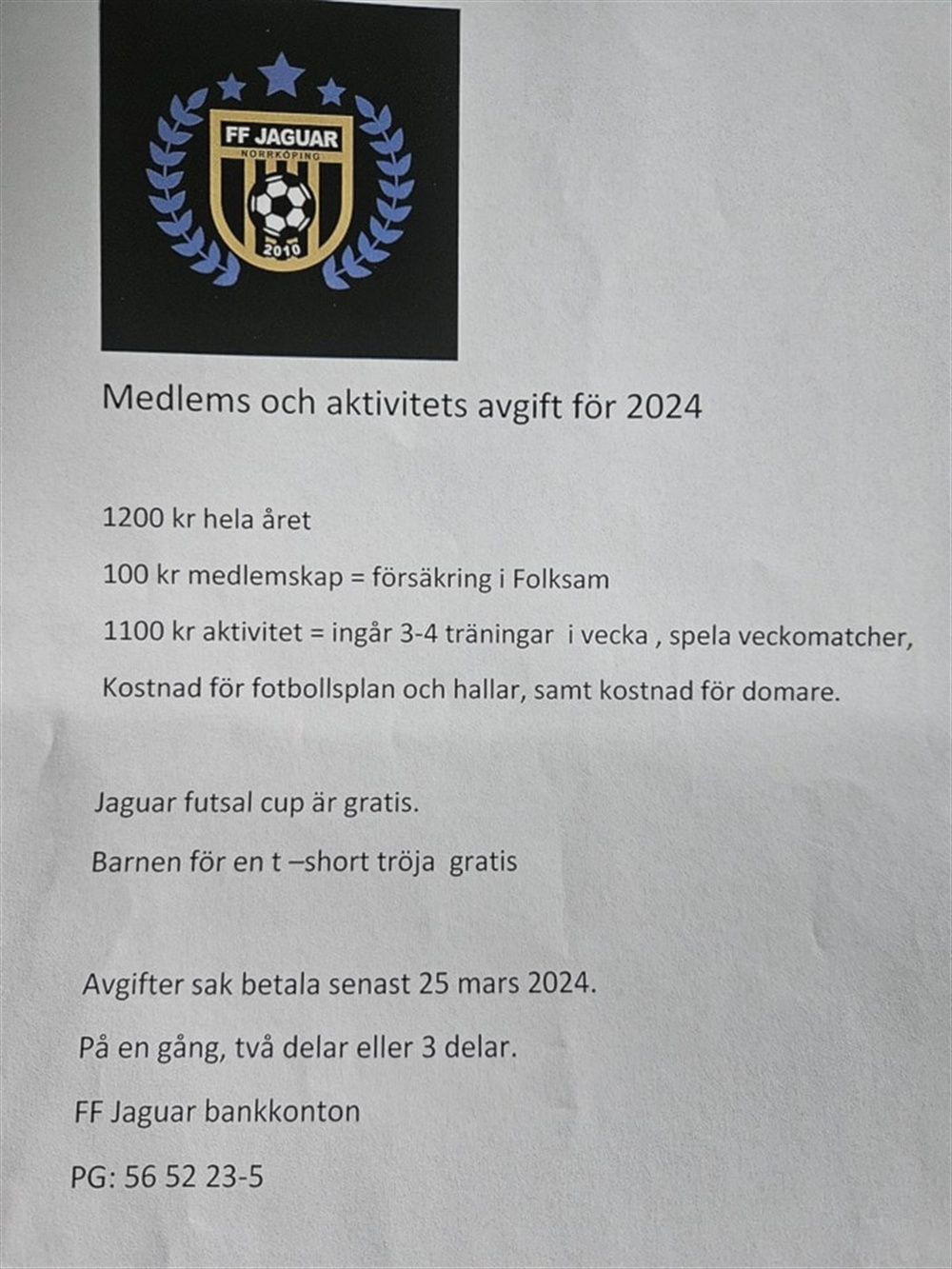 Just nu är det endast 3st som valt o betala och 2st kör delbetalning det betyder att vi inte har lag för 9v9 krävs minst 12-15 spelare 25:e mars är sista dagen för betalning har man inte betalat så får man inte träna vidare