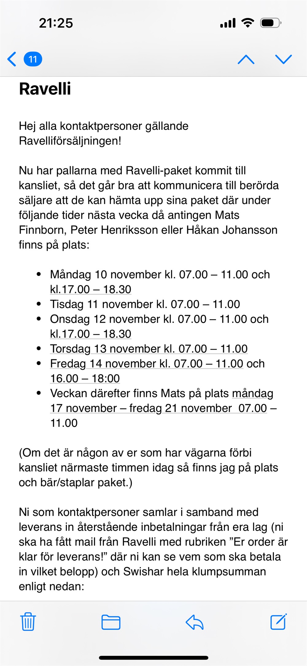Nu är det dags att hämta det man har beställt via Ravelli. Ni ser tiderna i bifogad bild. Ni ansvarar själva för att hämta era paket och leverera till de personerna som har beställt av er. Betalning görs till mig (Alexandra) på 0733660044 så betalar jag in till föreningen. Bra om ni har möjlighet att betala i samband med att ni hämtar paketen för det ska vara betalt så snart som möjligt.