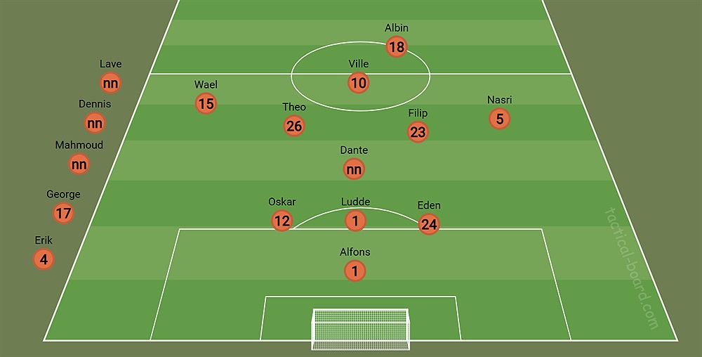 Samling 8:30 på Circle K Alla tar med sig Oranga strumpor! Målvakt Alfons Bremgård Backar 12. Oskar Lagnerö 24. Eden Gashi 11. Ludvig Larsson Mittfältare 20. Dante Lee Stark 15. Wael El-Ibrahim 26. Theo Samuelsson 23. Filip Ossowski 5. Nasri Kigozi Anfallare Mahmoud Aljasem 18. Albin Maxhuni 10. Ville Lindquist Avbytare 4. Erik Törnkvist Dennis Hoxha Lave Ingaskär 17. George Nasra