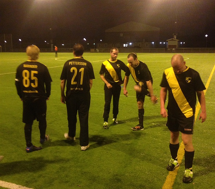 Precis som för några dagar sedan (och som alltid mot detta lag) blev det en jämn och tät match med mycket köttande. Coach Hegge överraskade lite genom att ställa över sig själv och istället sätta ner Svennis som mittback, ett drag som fungerade bra även om man tappade lite kraft på mittfältet. Den andra överraskningen var att Victor stod i mål då Sami tvingades lämna sent återbud. Tanken var att Victor och Robin skulle stå varsin halvlek men den förstnämnde erbjöd sig att stå hela matchen vilket 21:an Pettersson glatt accepterade. Dock fick han finna sig i att spela ytterback.