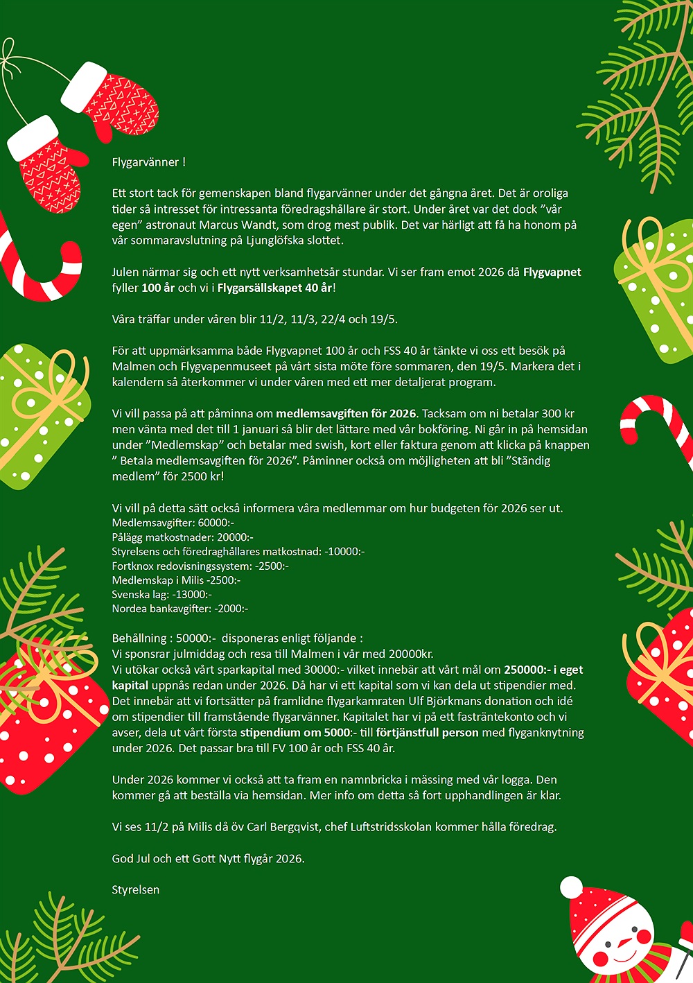 Vi skapar samhörighet mellan personer med flyganknytning genom trevliga möten i Militärsällskapets lokaler, Valhallavägen 104. De inleds med pub och mingel då du får tillfälle att umgås med dina gamla flygarkamrater och göra nya bekantskaper. Därefter får vi höra ett intressant föredrag med flyganknytning och efter det en gemensam middag.