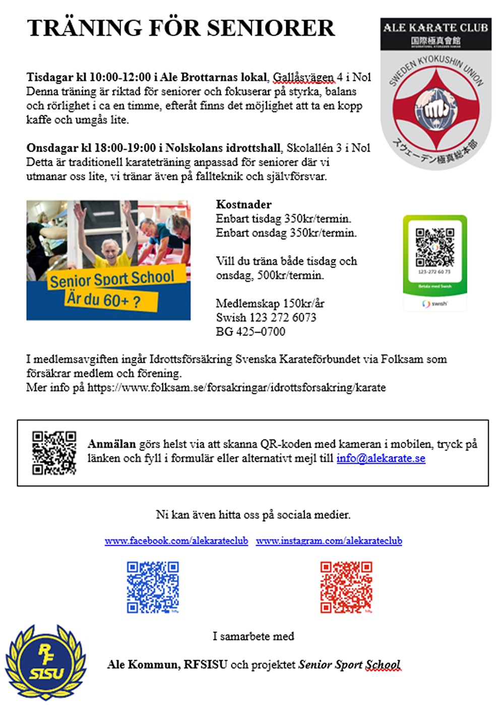 Anmälan görs helst via att skanna QR-koden med kameran i mobilen i bilden ovan, tryck på länken och fyll i formulär eller alternativt mejl till info@alekarate.se