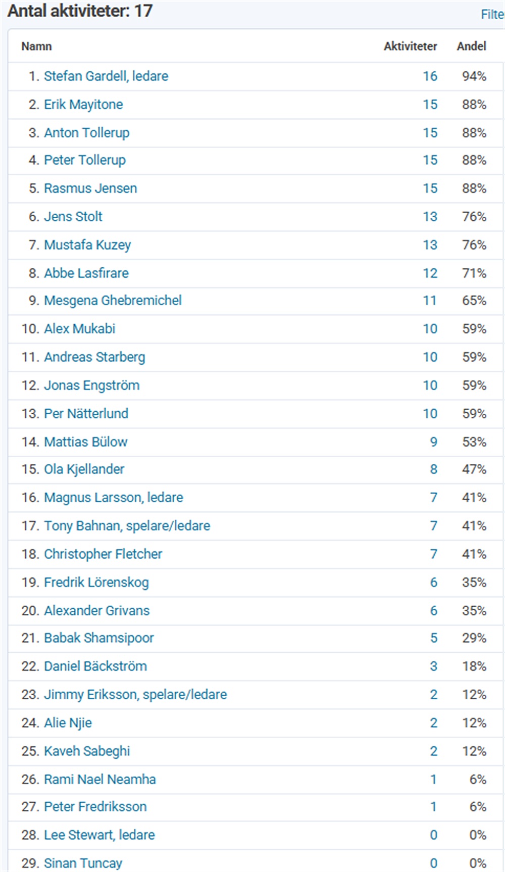 Vi behöver alla ta oss en funderar på om vi ska anmäla ett lag nästa säsong eller inte. Ovan ser ni hur många eller hur få matcher alla har spelat denna säsong!