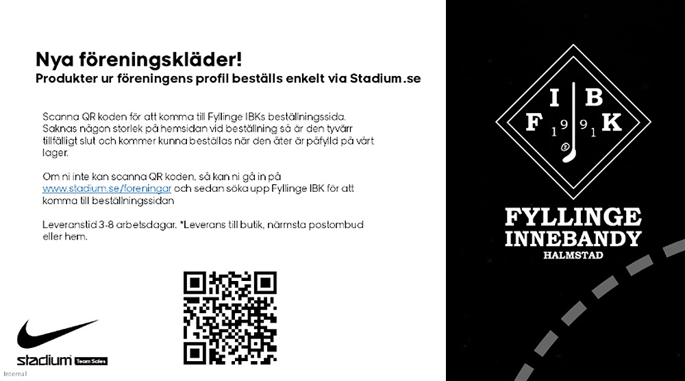 Ni som vill gå gärna in på ”mina sidor” på Stadium.se och ”Stöd din förening” och leta upp Fyllinge Innebandyklubb. När du stödjer föreningen behåller du din egen bonus men ger 3 % extra bonus till föreningen! Gäller när ni handlar både föreningskläder och övrigt sortiment.