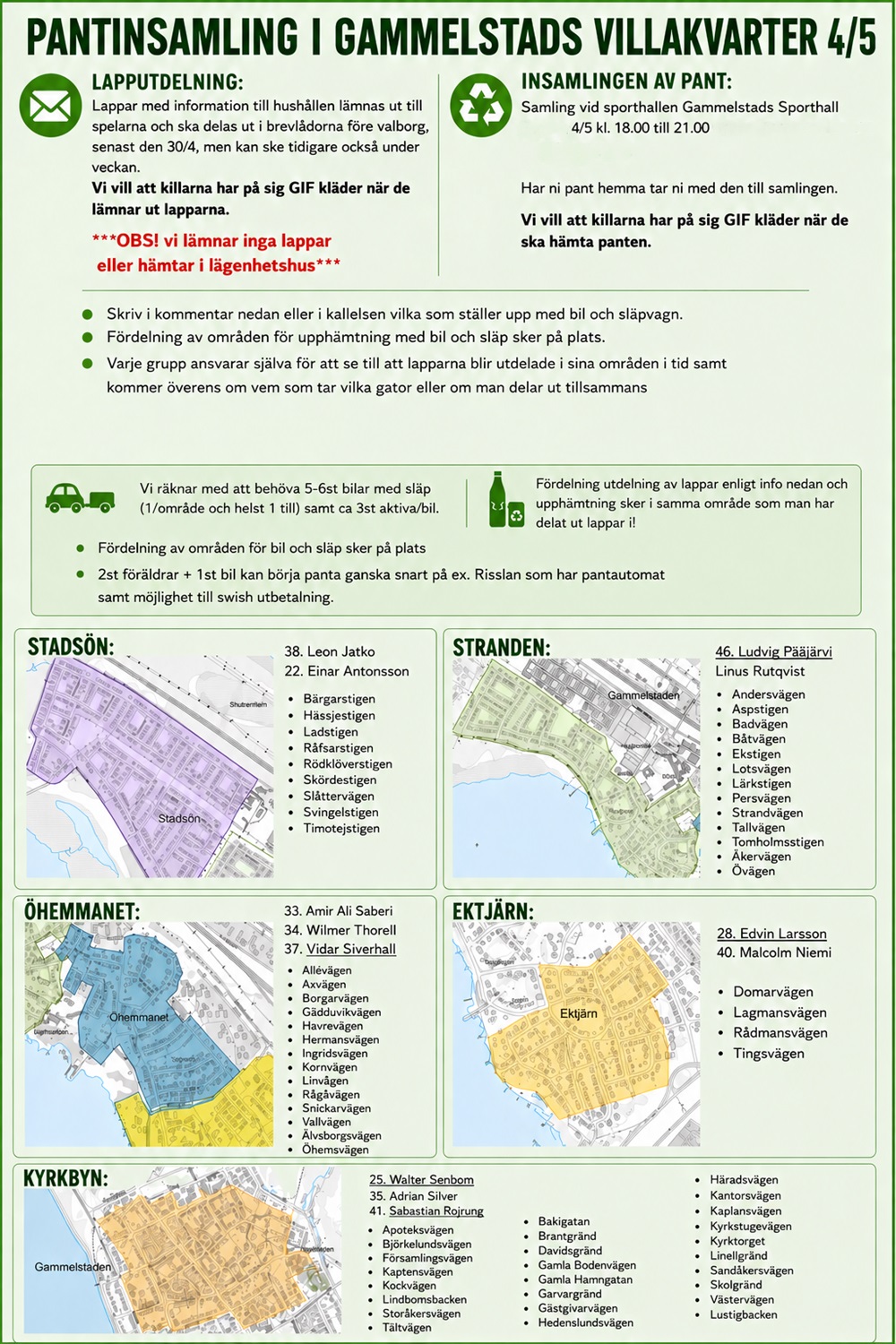 Fördelning utdelning av lappar enligt info nedan och upphämtning sker i samma område som man har delat ut lappar i!
