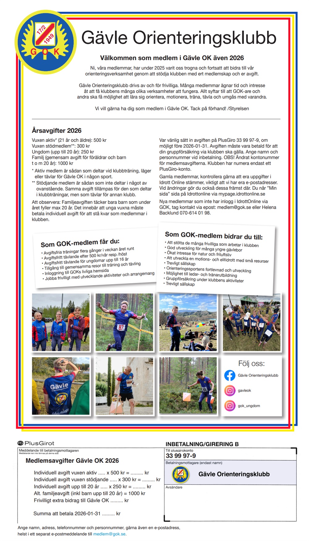 Nu är det dags att betala in 2026 års medlemsavgift i Gävle Orienteringsklubb. Se bifogat medlemsbrev.