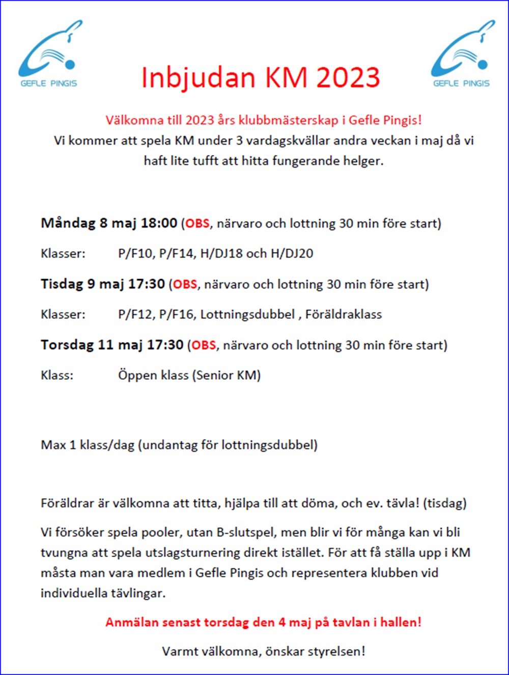Vi kommer köra Klubbmästerskap 8-9:e och 11:e maj. Inbjudan och anmälningsblanket sitter uppe i hallen! Anmäl er under nästa vecka!