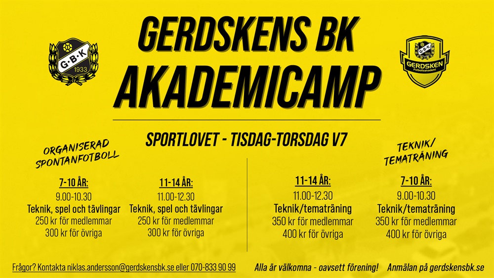 Precis som på höstlovet väntar tre camp-dagar på Gerdskenvallen på sportlovet, vecka 7. Alla spelare, aktiva eller ej och oavsett förening, mellan 7-14 år kan nu anmäla sig till Gerdskens akademicamp!