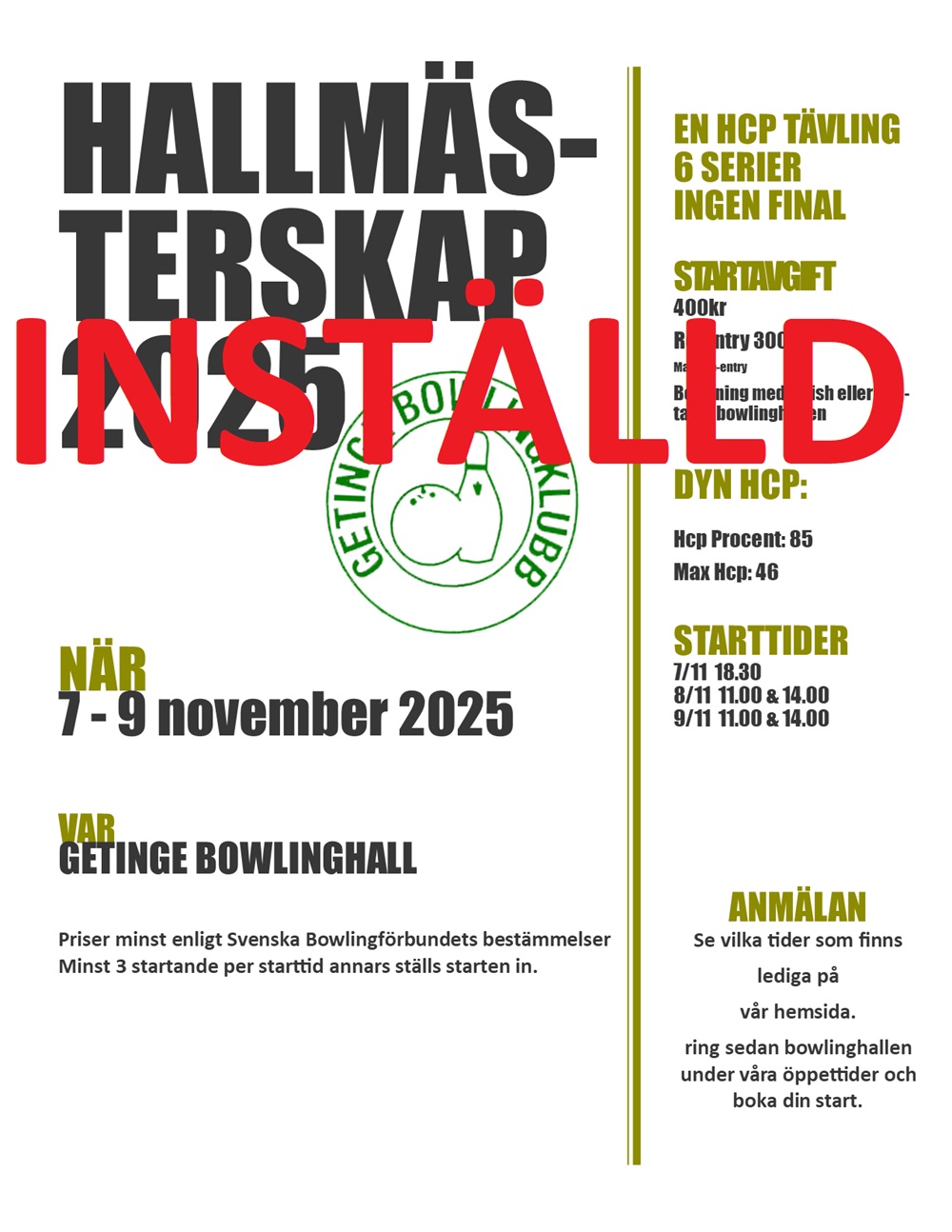 Tyvärr så har vi, för första gången någonsin, blivit tvingade attställa in en tävling. Vi har helt enkelt för få anmälningar för attdet ska gå att genomföra tävlingen.