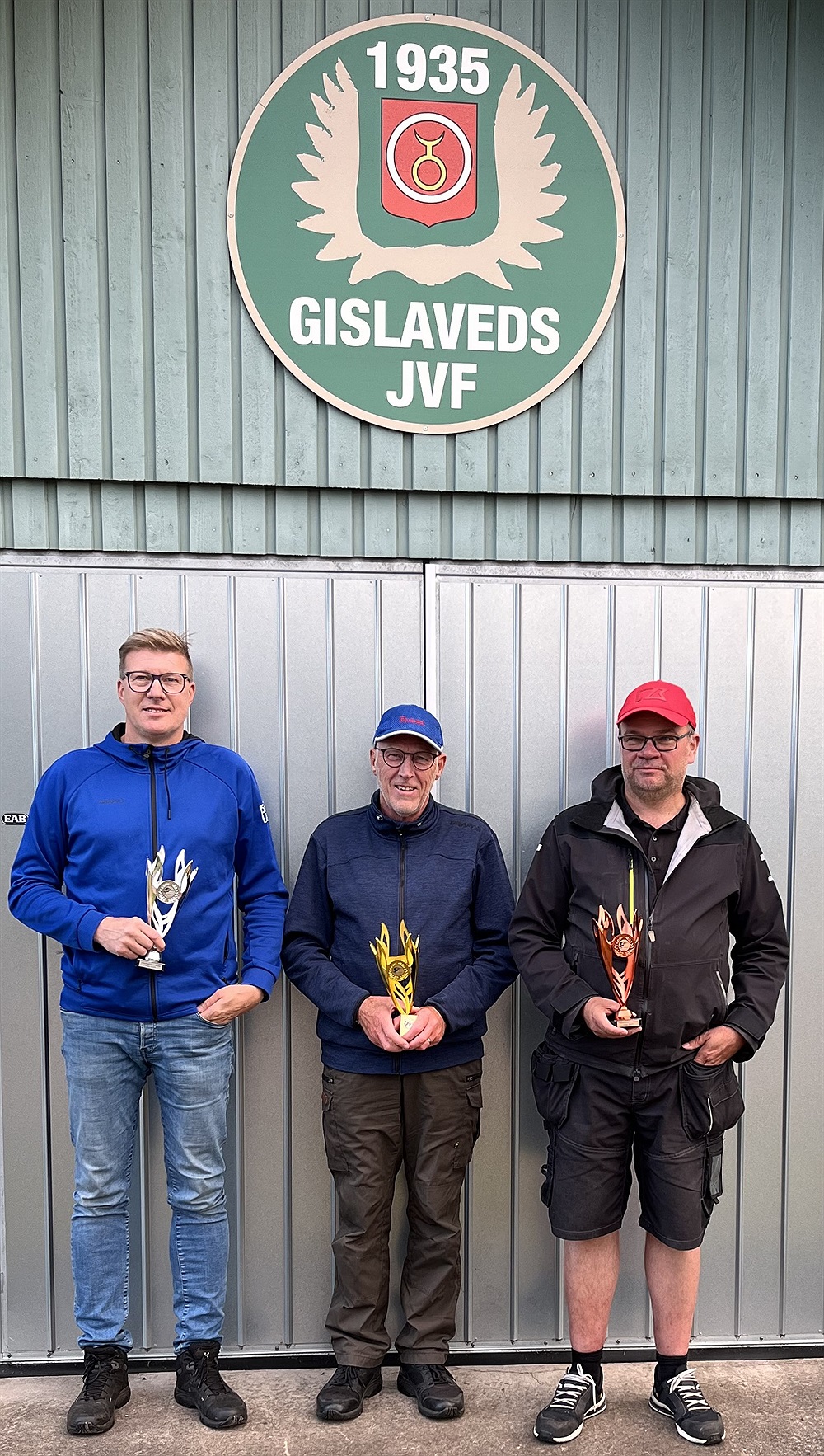 2025-års VästboMästare N-Trap Bertil Nilsson flankerad av 2:an Stefan Hoof, tv och 3:an Ulf Mårtensson ,th