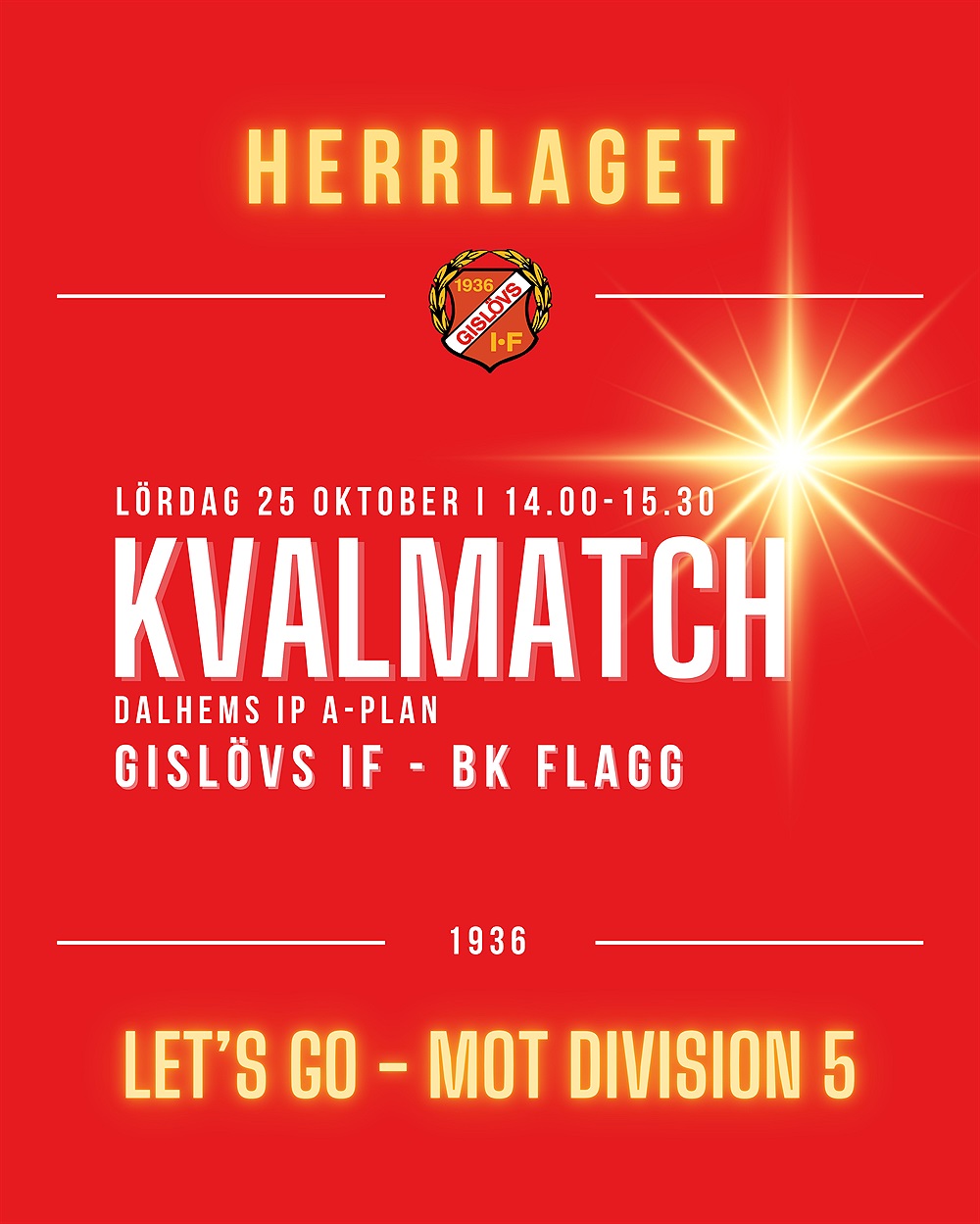 På lördag den 25 oktober kl.14.00-15.30 spelar vårt herrlag ännu en gång kvalmatch mot BK Flagg, men denna gång på bortaplan (Dalhems IP A-plan). På lördag gäller det Gislöv! ⚽️