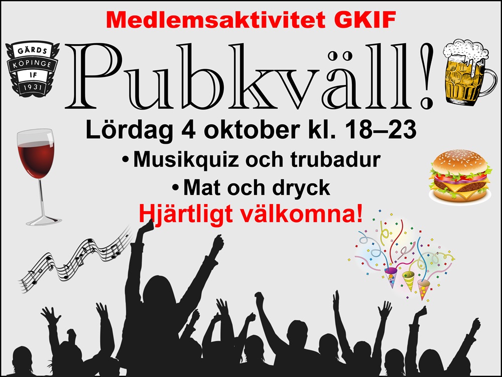 Boka in den 4 oktober! Då är det åter dags för pubkväll för klubbens medlemmar. Mer information kommer närmare tillställningen.