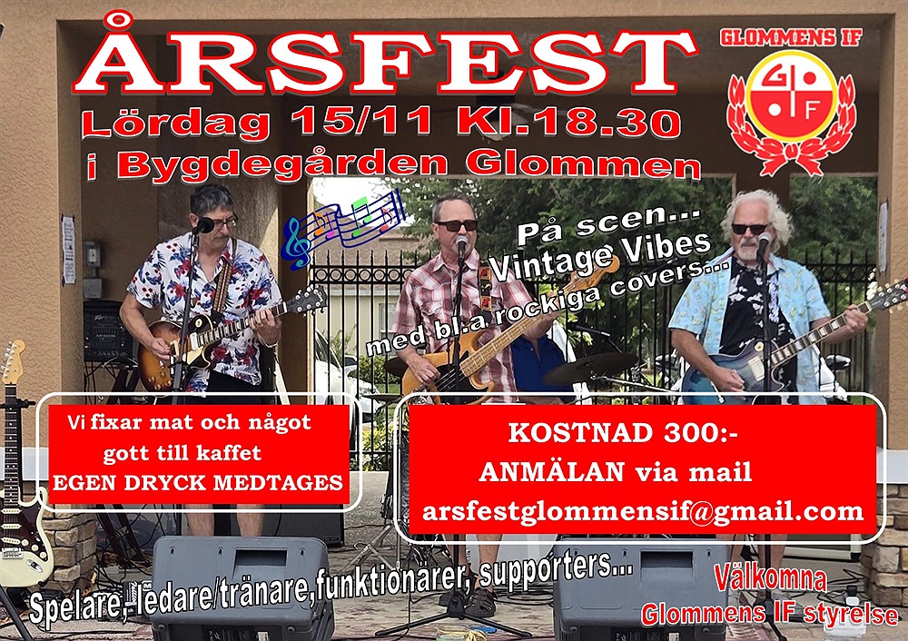 Nu är det dags att planera in årets kanske festligaste kväll…Glommens IF härliga årsfest lördag den 15/11 med bl.a god mat och underhållning. Glöm nu INTE att anmäla er…via mail…arsfestglommensif@gmail.com. Kostnad 300:-. OBS. MEDTAG EGEN DRYCK......