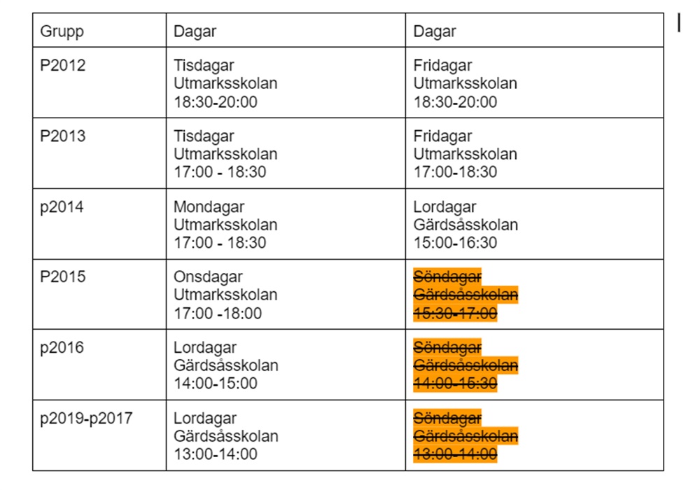 Här är träningstiderna från vecka 3 (måndag 13 januari) till vecka 13 (söndag 30 mars)