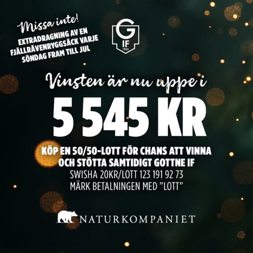 Potten är nu uppe i 5 545 kr! Passa på att köpa dina lotter och se vinstsumman växa ännu mer På söndag 7/11 drar vi nästa vinnaren av en Kånken-ryggsäck från Naturkompaniet. Lotterna kostar 20kr/st och du köper dina lotter genom att swisha summan för en eller fler lotter till 123 191 92 73 och märker betalningen med "Lott" Dragning av en kånken-ryggsäck varje söndag fram till jul och dragning av vinstpotten sker söndag 21/12.
