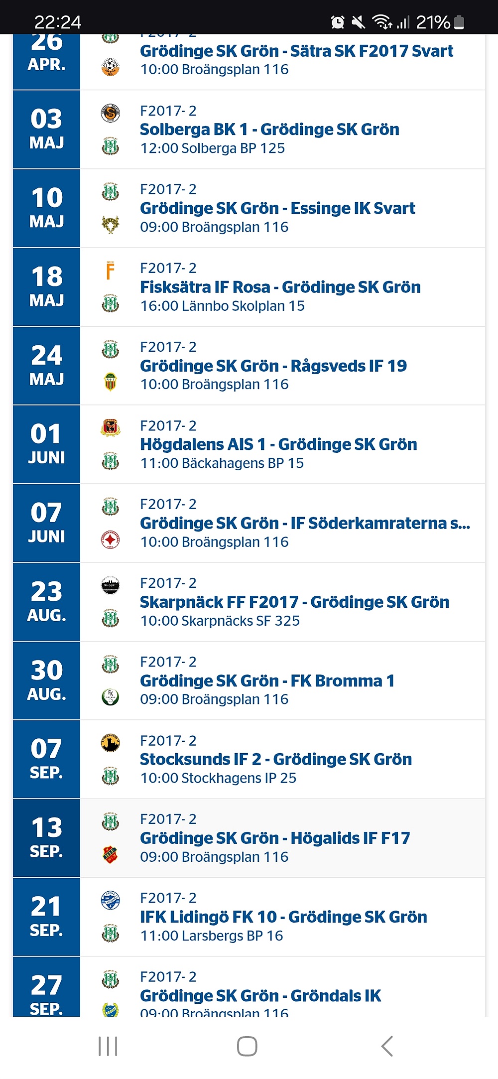 I kalendern ligger samtliga dagar, motståndare och tider inlagt men skickar även med en liten printscreen på vårt spelschema.