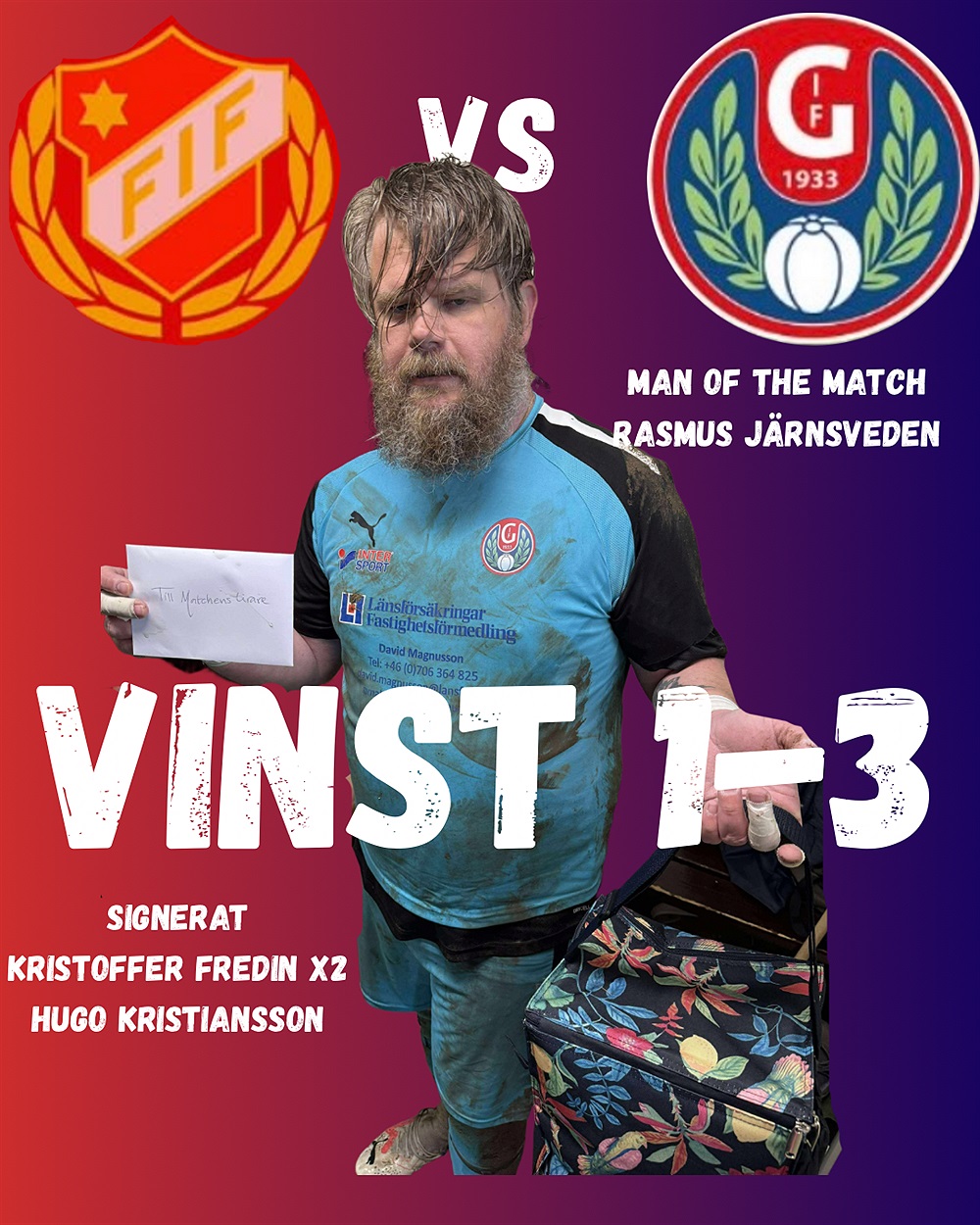 Första målet kom strax innan första halvleksslut efter en fin etablering på motståndarnas planhalva och där den rullar från höger sida genom centertanken Ludvig Andersson vidare till mig själv där jag lite turligt får en rätt felträff och rullar in den i första burgaveln. Det andra målet kom efter lite påpasslighet där jag ser möjligheten att trycka in bollen i nät när målvakten missar tillbaka bröstningen från deras mittback. MEN MEN MEN, tredje målet är taget från skolboken för där kommer han, likt en Carles Puyol i el Classico i början av 2000-talet lyckas han hamna helt ren mitt i slottet och kan nicka in det tredje målet för Grohed, Hugo Kristiansson assisterat Axel Mannberg. Wow! Tackar och bockar gubbar.
