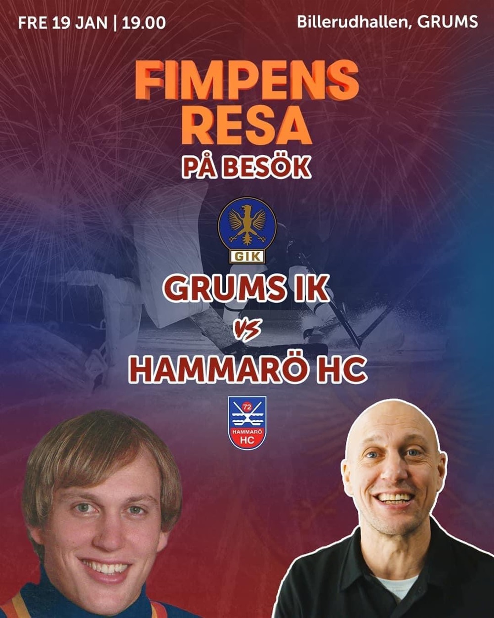 Ja viken kväll detta ska bli. Först och främst toppmötet där viktiga poäng står på spel i en oerhört jämn tabell topp. Sen kommer Christian ”Fimpen” Eklund och spelar in ett avsnitt av Fimpens resa, ett program som finns att se och följa på youtube. Christian själv spelade ca. 500 matcher i SHL (Elitserien) för Djurgården. Så en riktig profil att träffa i Billerudhallen. Men Christian får ursäkta, största profilen är dock ingen mindre än bygdens son, Christoffer Skåån, en stor del av programmet kommer handla om just Skåån, och självklart får ni med största sannolikhet träffa honom någonstans på läktaren. Dessutom bjuder vi på godisregn- brandbilar på plats- Coop lottar ut tre påsar med något gott i- Grillade hamburgare mm mm ja se, detta ska ni inte missa, det blir fredagsfest kära vänner.