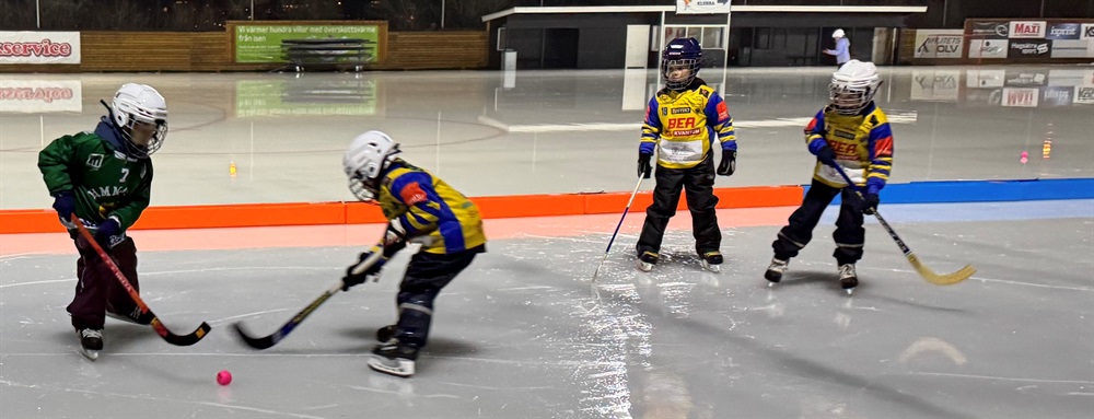 Bandy på blöt is under söndagens poolspel i Sollentuna