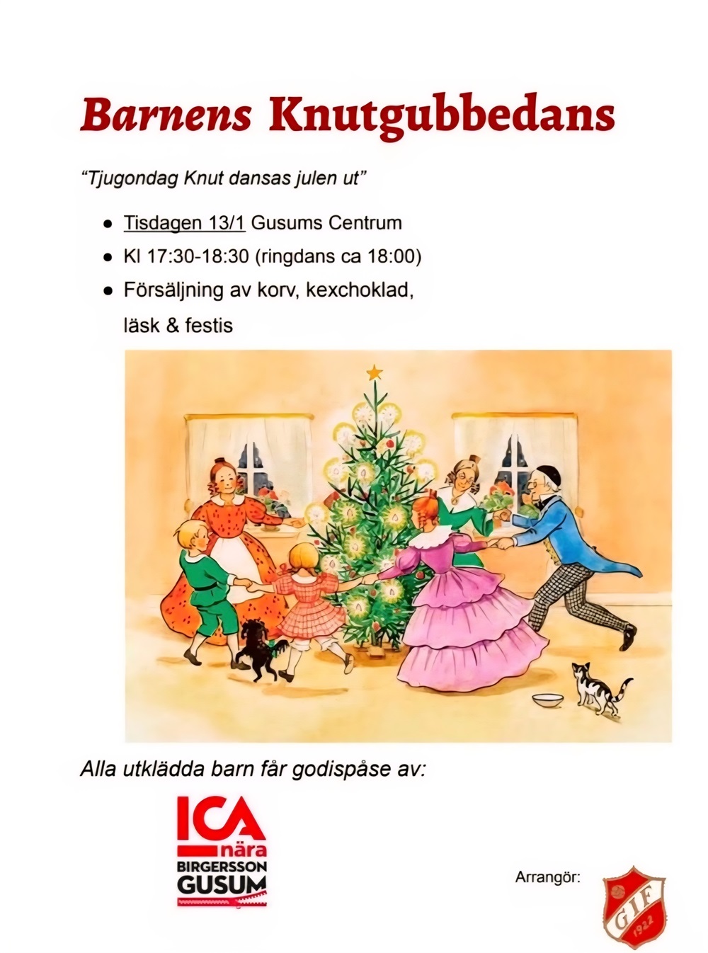 Knutgubbedans i Gusums centrum. Varmt välkomna stora som små att dansa ut julen tillsammans med oss. Alla utklädda barn får något gott från Ica Birgersson.