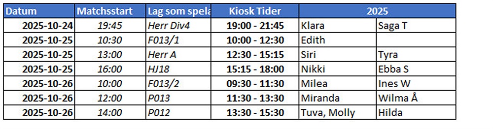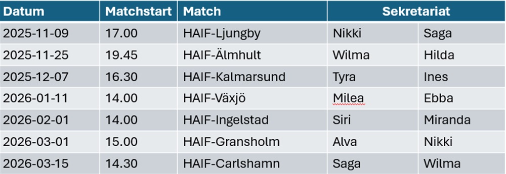 Bemanning för sekretariatet på våra hemmamatcher. Vi behöver er föräldrars hjälp, se bifogat schema.