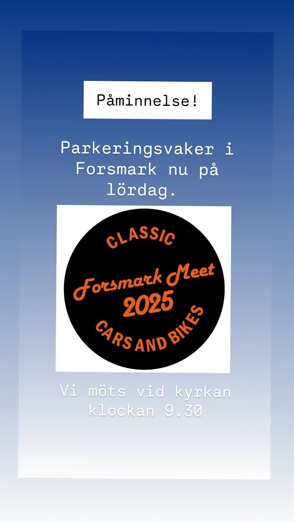 Påminnelse att det är nu på lördag som föreningen är parkeringsvakter vid Forsmarks car meet. Vi behöver er hjälp för att denna dag ska vara möjlig och den brukar ge ett stort plus i kassan. Anmäl er till Jörgen Kjellström på nr 070-317 33 46 om ni har möjlighet att hjälpa till om ni inte redan har gjort det. Desto fler vi är desto trevligare blir det.