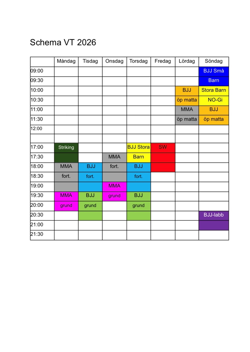 Vi erbjuder MMA, BJJ, SW, Striking samt BJJ för barn. MMA, SW och strikning är från 15 år.
