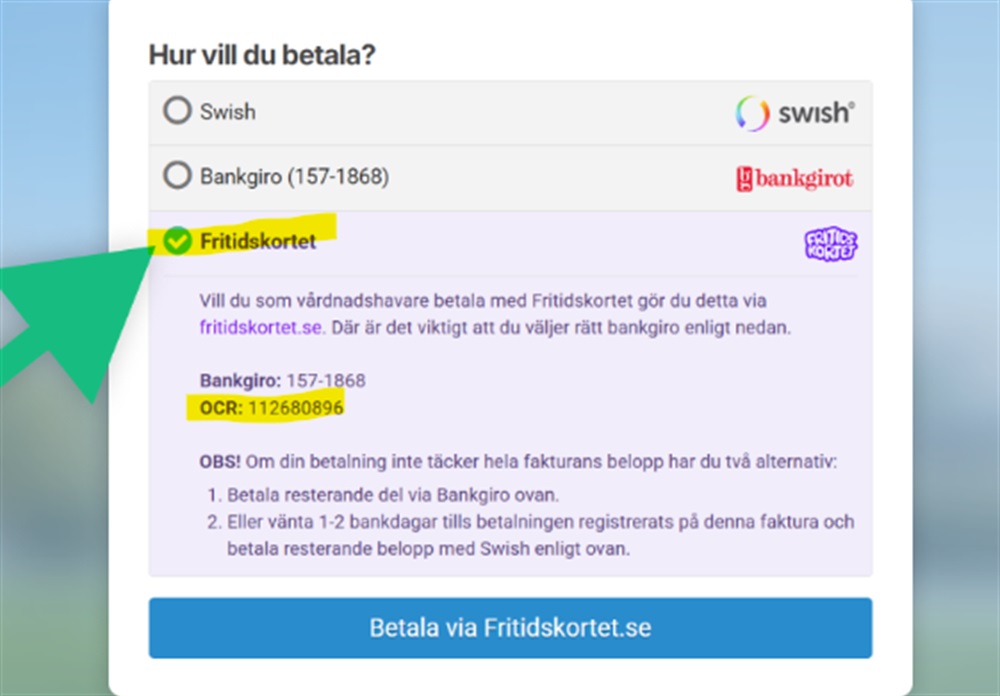 Då anger du på fakturan att du ska betala viss del via Fritidsdskortet, väntar 1-2 bankdagar och betalar sedan resten