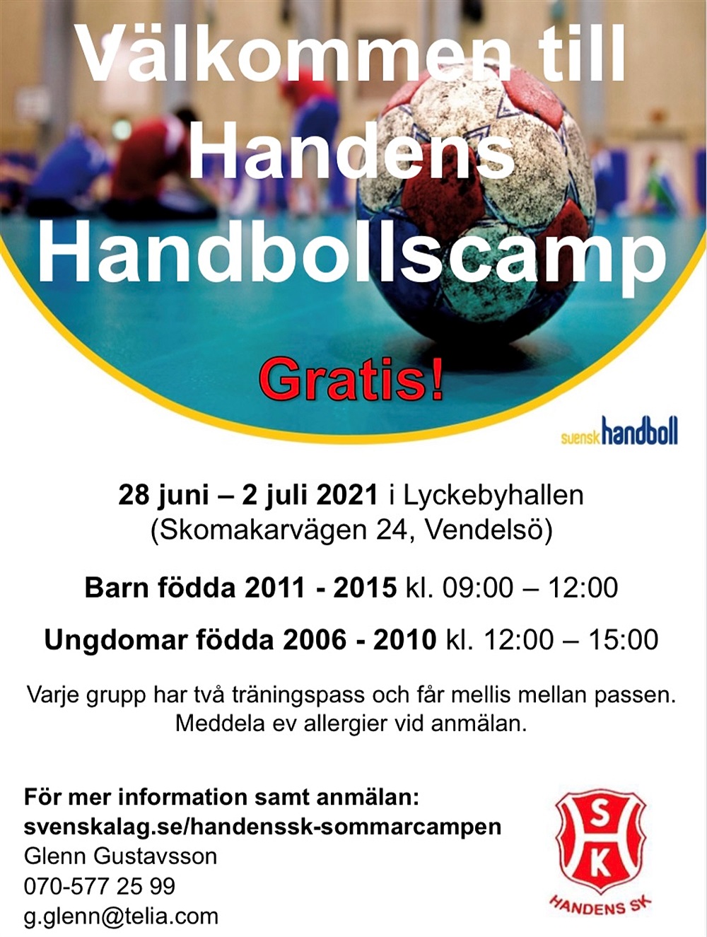 OBS, ny hall i år! Tyvärr har kommunen beslutat att Torvalla träningshall ska användas för vaccinering istället för barnverksamhet. Detta gör att vi inte kan ha vårat träningsläger i Handen som vi brukar utan vi har istället fått halltid i Lyckebyhallen, Vendelsö. Vi hoppas verkligen att ni ändå vill och kan komma på lägret. Vi ses!