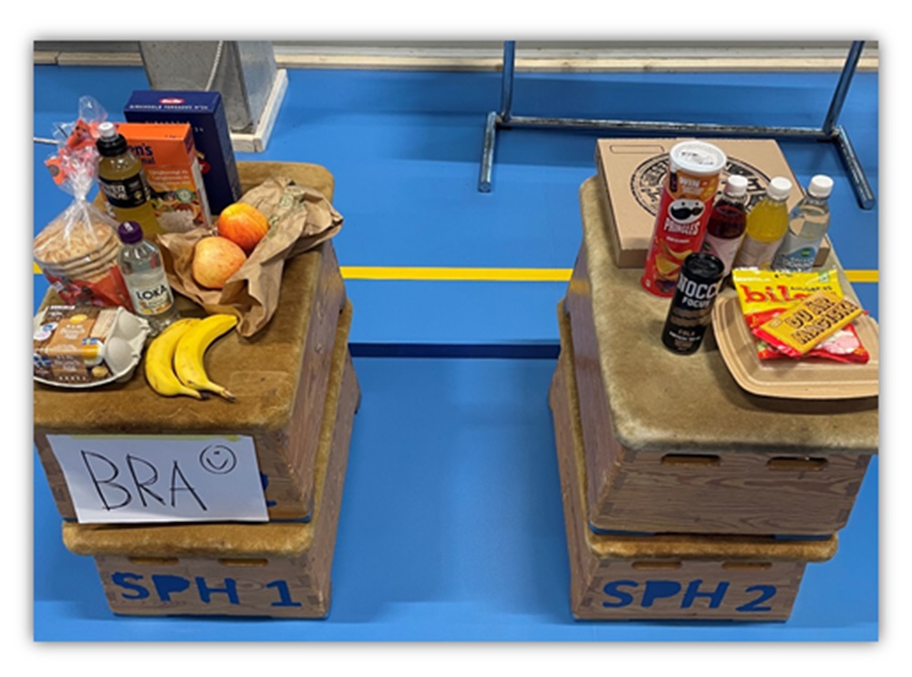 Undertecknad hade en kasse med diverse varor och tillsammans sorterade vi bra och dåliga på varsin plint. Vårt gäng har riktigt bra koll och det kom många kloka tankar. I helgen hjälper vi varandra att göra bra val så vi kan prestera på topp. Innan match blir det ingen kebabpizza med extra allt men efteråt kanske det kan bli en slice eller två - "Balans i livet" :)