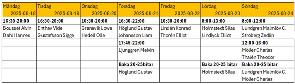 Nästa veckas kioskschema är här. Tanken är att man inte ska behöva stå ensam i kiosken första gången, därav dubbel bemanning.