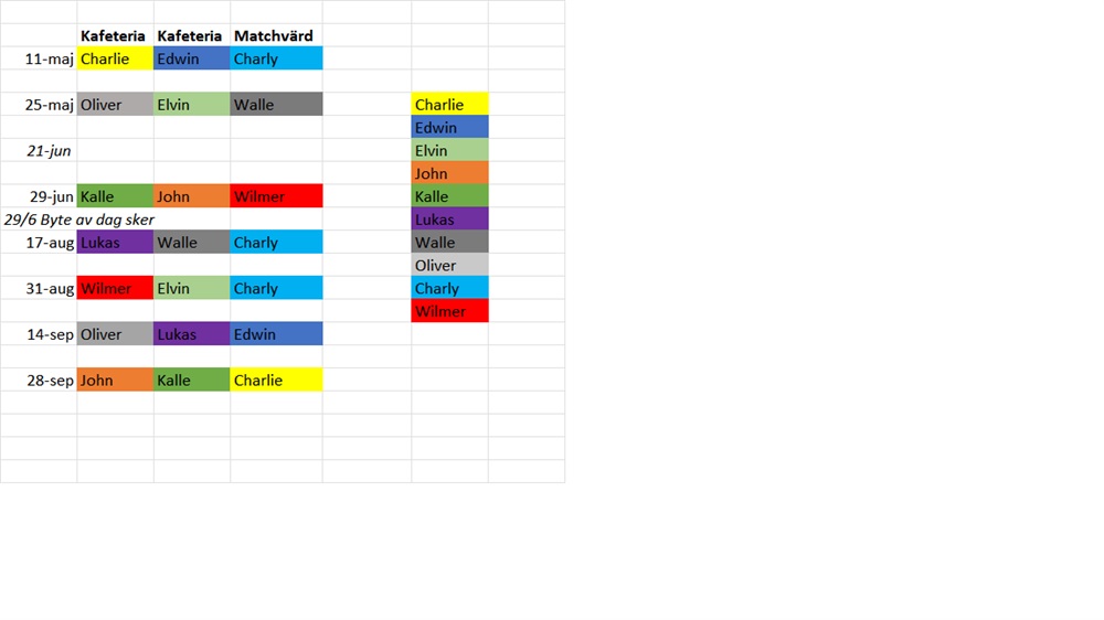 Bemanningen för hemmamatcherna enligt följande bild. Byt med varandra om ni inte kan