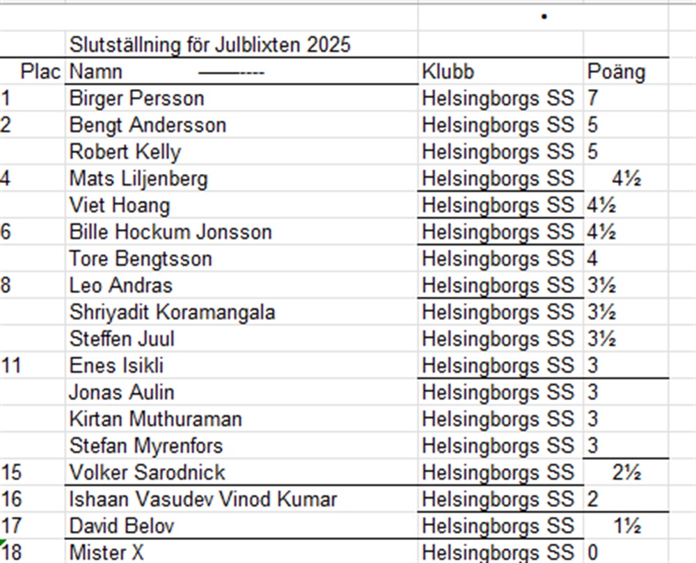 I torsdags var det julavslutning och som vanligt hade Tore och Eva åstadkommit ett välsmakande julbord. 17 medlemmar år och trivdes. Efteråt spelades den traditionella julblixten och som bilden visar var Birger helt omutlig och vann samtliga partier. Grattis! I andra änden av tabellen blev Mister X helt utan poäng, men vi hoppas han trivdes ändå :-)