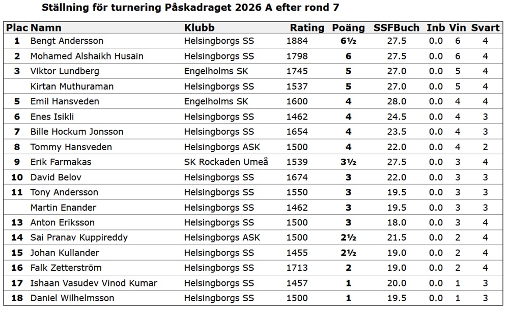 Det blev 18 deltagare i årets upplaga av Påskadraget och Bengt Andersson vann, en halv poäng före Mohamed Alshaikh Husain. På delad tredjeplats kom Viktor Lundberg och Kirtan Muthuraman. Gratulerar till pristagarna!